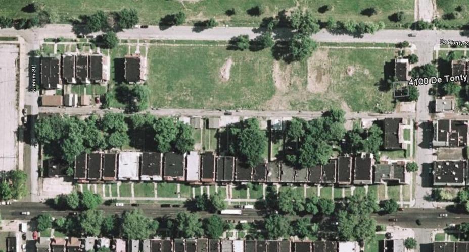 Comparing an aerial view of the current conditions on the 4100 block of De Tonty Street to the aerial view of the block immediately to the south, it’s easily seen how such a huge hole in the neighborhood fabric is a shock to this dense neighborhood. The best solution is an immediate and full restoration of the street wall by filling in the hole to at least the historic density that was recently lost.