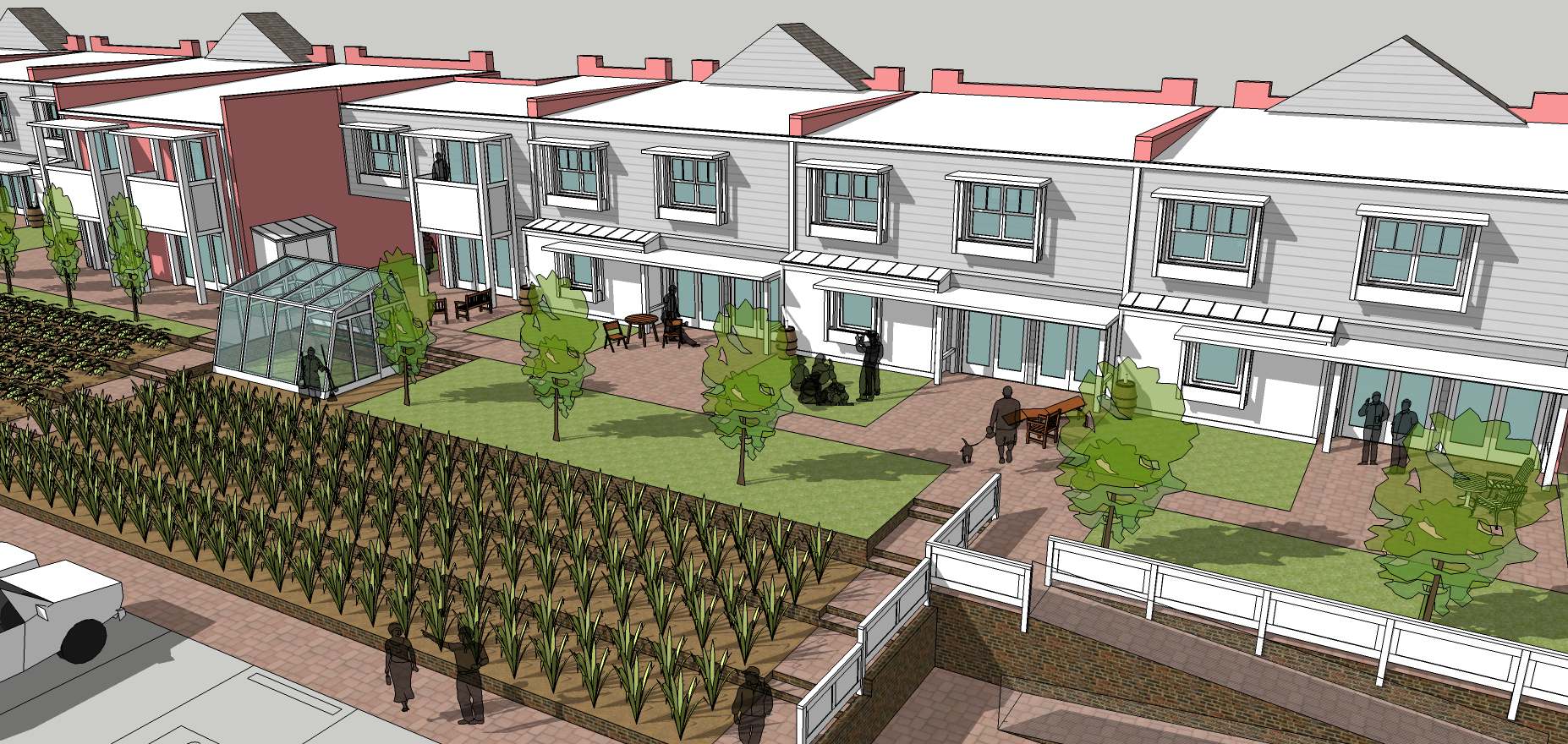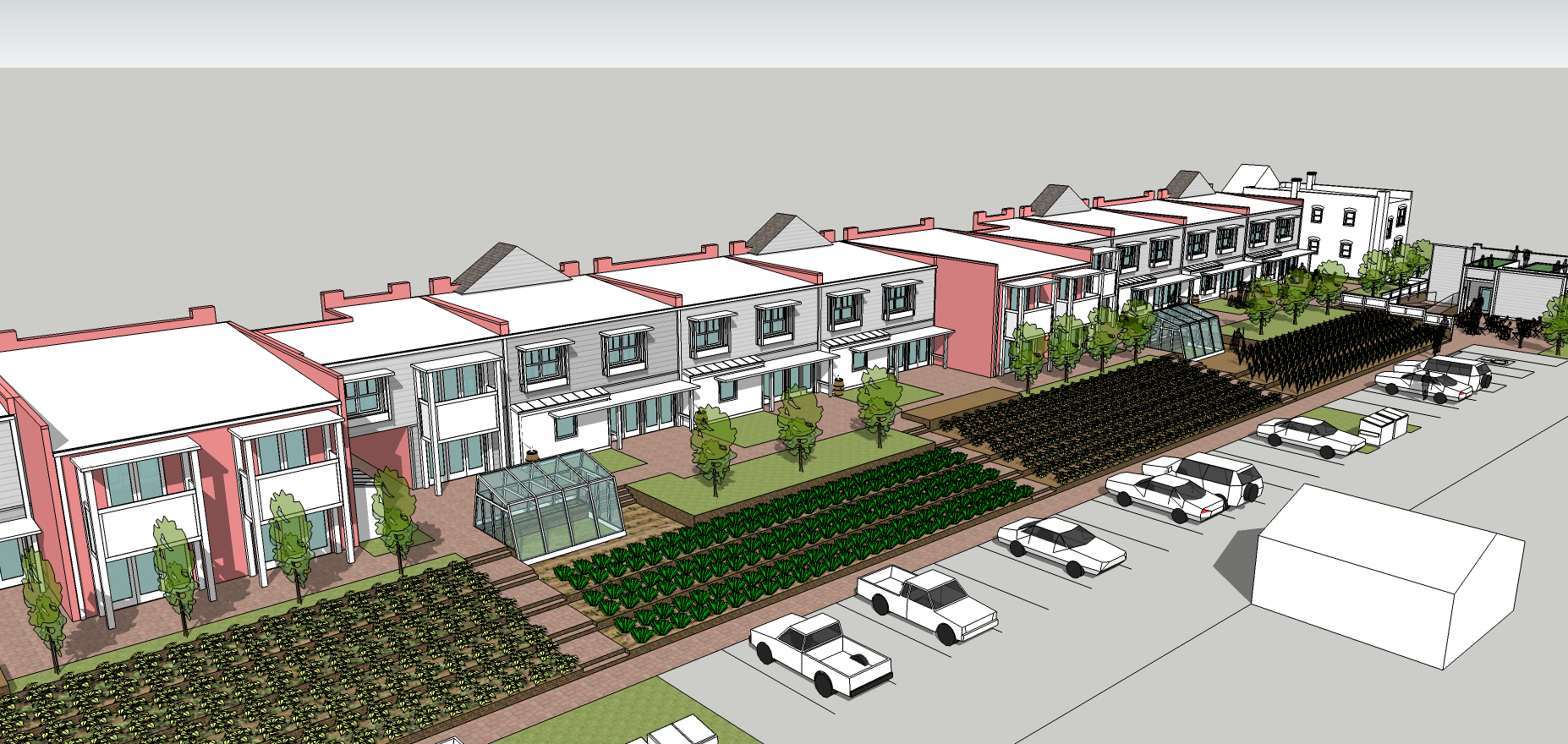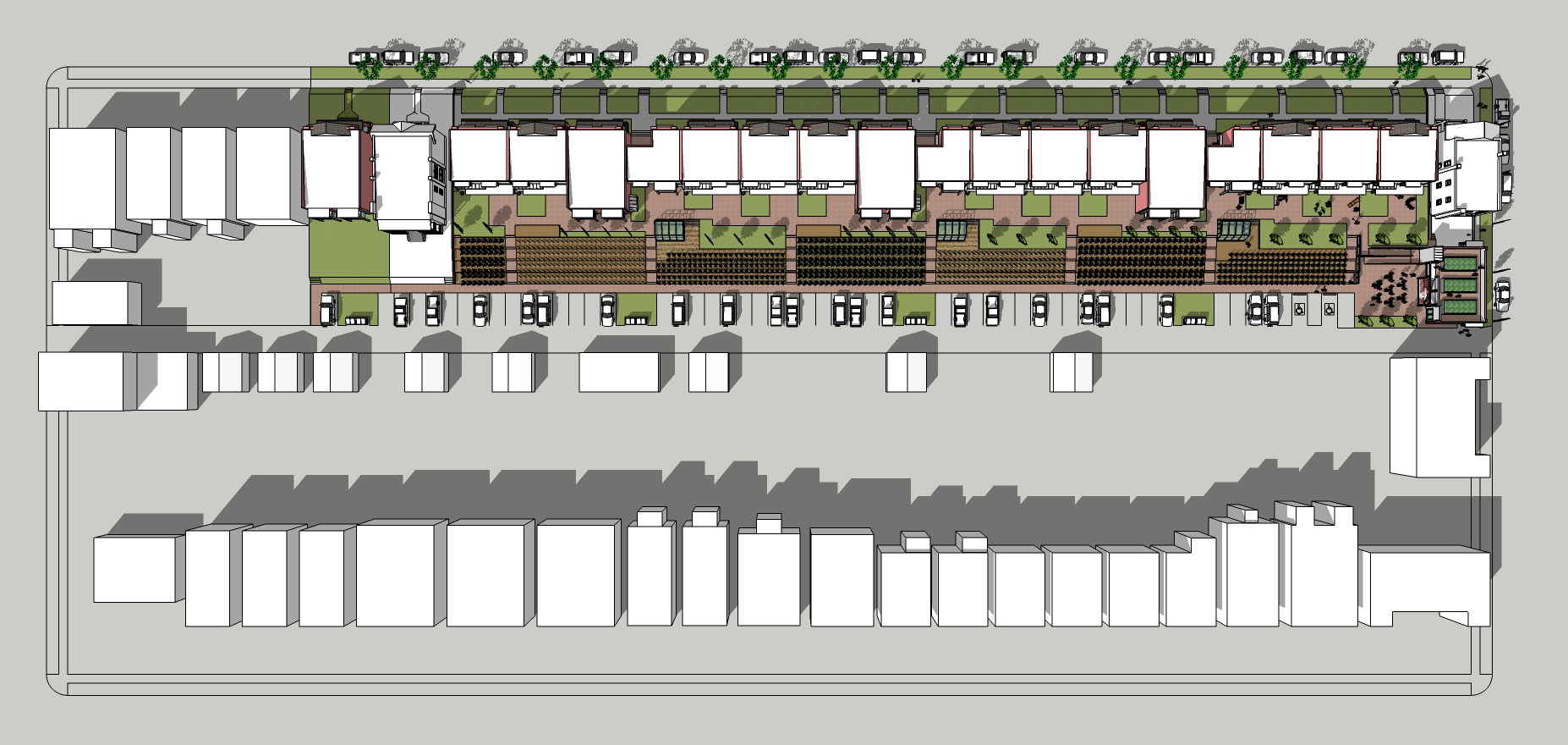 The more than 600 feet of expanse to be filled requires a solution that provides intermittent breaks like through-passages between moderate building lengths, projecting units and accessory structures like greenhouses to relieve redundancy and provide for comfortably scaled enclaves.