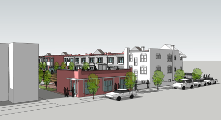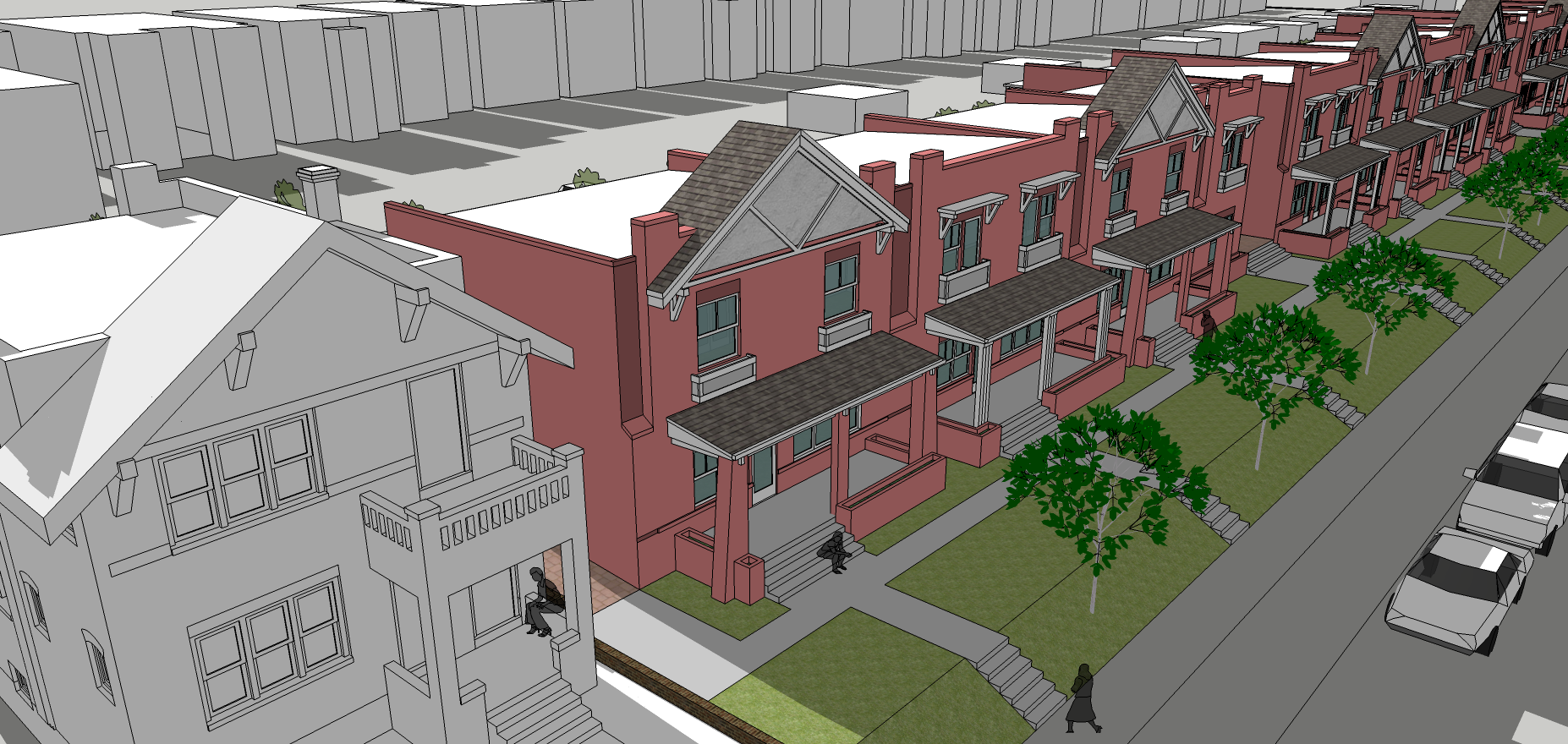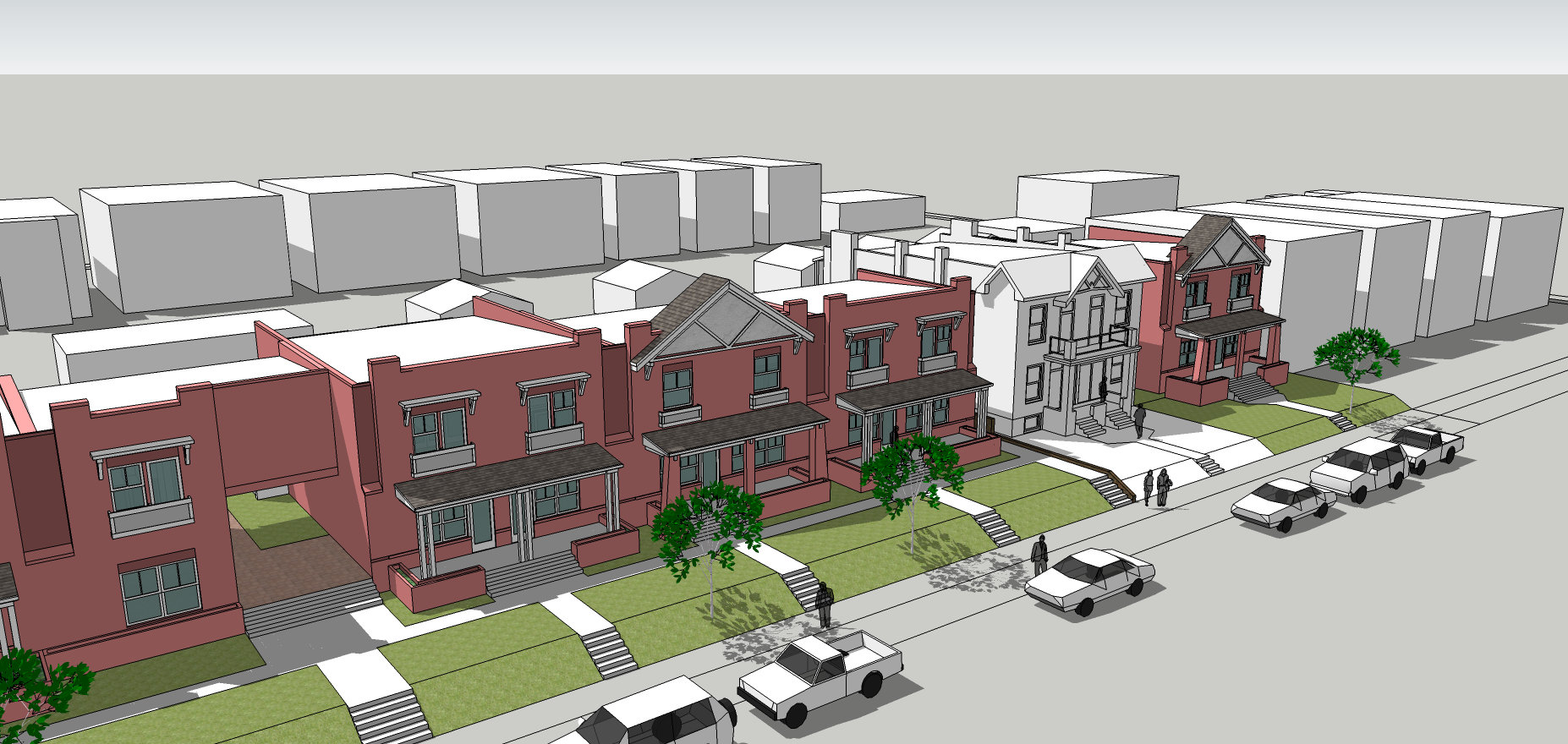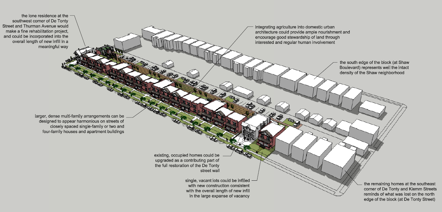 An overview of the 4100 block of De Tonty Street shows what should be in the more than 600 foot long expanse of vacancy, and that is a full restoration of the historic density recently lost at the half-block site. The proposal shown includes 20 new owner-occupied residential units, and an additional 6 remodeled existing rental units.