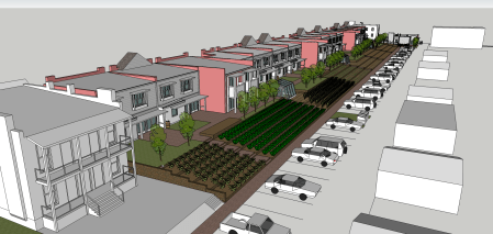 With the solar exposure to the south, the half-block site offers a natural solution to agricultural crop plantings, and the terraces step down to alley parking from semi-private garden and yard spaces elevated to the main floor level of the residential units.
