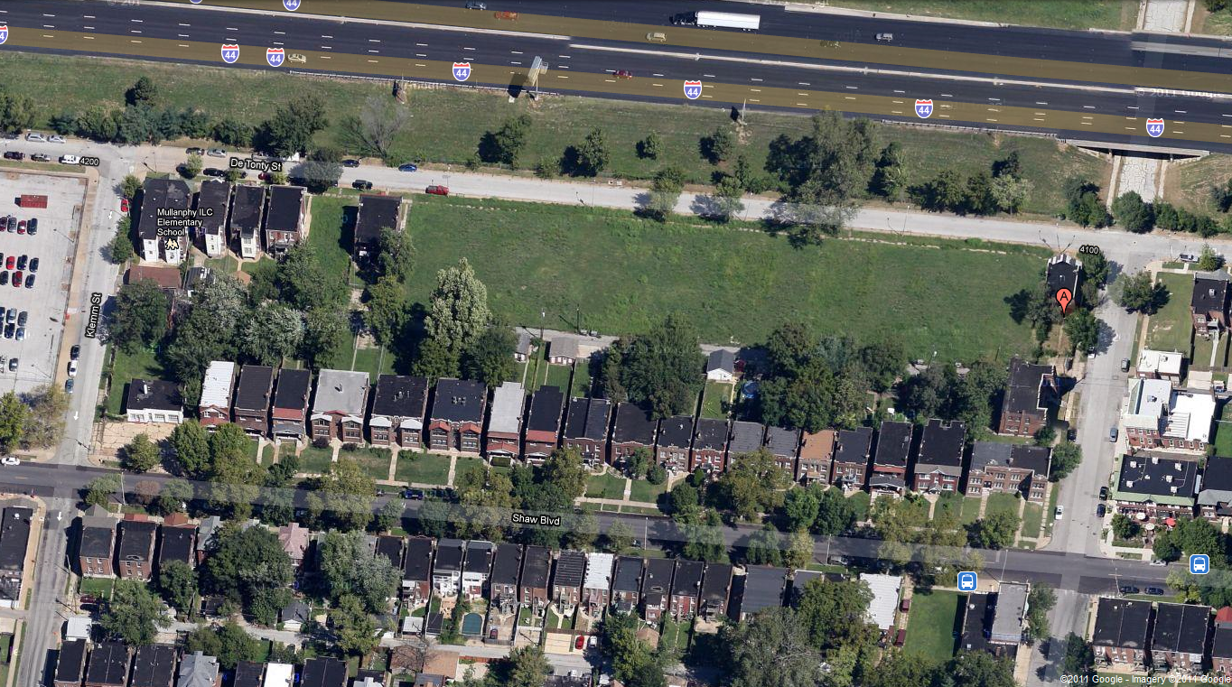 A really big hole. A fairly astonishing scene from the high vantage of eastbound I-44, to be sure, and it’s a wonder that an expectedly intact neighborhood like Shaw would be home to such a sizable gash in the otherwise dense fabric.  A sole two-family home, at the southwest corner of De Tonty Street and Thurman Avenue, is left to bookend the 600 foot-long absence between the far eastern end of the barren half-block, and what remains of the 1920s era historic street wall at the western end of De Tonty. The five houses anchoring the southeastern corner of De Tonty and Klemm Streets offer clues as to what was recently lost on the 4100 block of De Tonty between Klemm Street and Thurman Avenue but the decrepit stature of the rather young ruin, standing alone at the southwest corner of De Tonty and Thurman, reminds us of what could become of some great St. Louis neighborhoods and has already become of so many others. Though any presumption that this really big hole signals sustained and reckless trends in attempted speculative real estate projects is misplaced, the removal of structures to make way only for options or promises is of questionable wisdom.