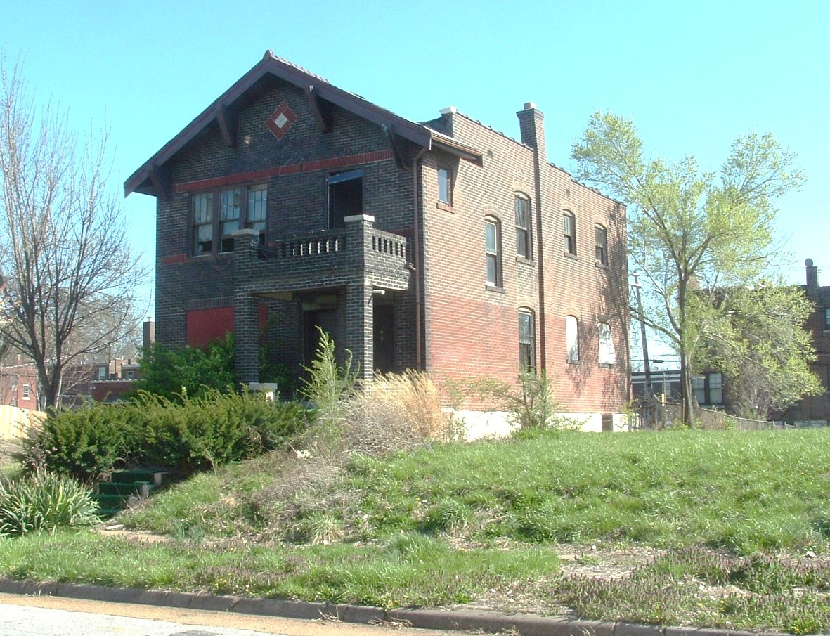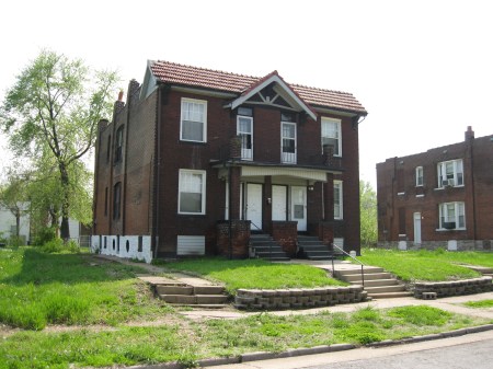 The vacant 2-family home at 4100 De Tonty sits alone at the far east end of the half-block site, separated from the far west end of the half-block by more than 600 feet. The rather recent exposure to the elements has accelerated the descent into the crumbling state of this otherwise handsome building (click to enlarge any image in this post)