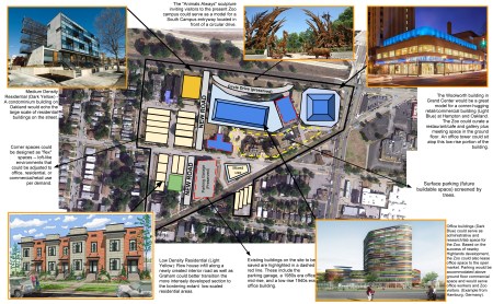 Instead of your corner building, I imagine something more like Singapore’s ION (http://farm5.static.flickr.com/4047/4316672652_3a5493510f.jpg), with the tree/stick pillars replaced by elephant trunks or giraffes or something, a huge animal themed gateway at the corner that invites pedestrians into the zoo’s Dogtown campus and implies safe walking across Hampton as an essential part of the zoo experience. Significantly it would also further signal the zoo’s presence to those driving down below on the never-to-be-removed highway. I understand the desire for a neighborhoody sort of structure, like the Woolworth building, but the highway and Hampton need to be tamed my something less understated. Put the neighborhoody stuff where you’ve designated a parking lot. Make the corner into a landmark.