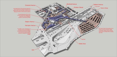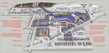 Seen in an aerial view from the northeast, the entirety of the proposed redevelopment area is assigned a reuse or surrounding fabric is repaired [click to enlarge].