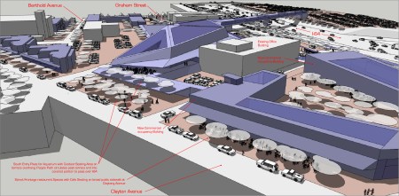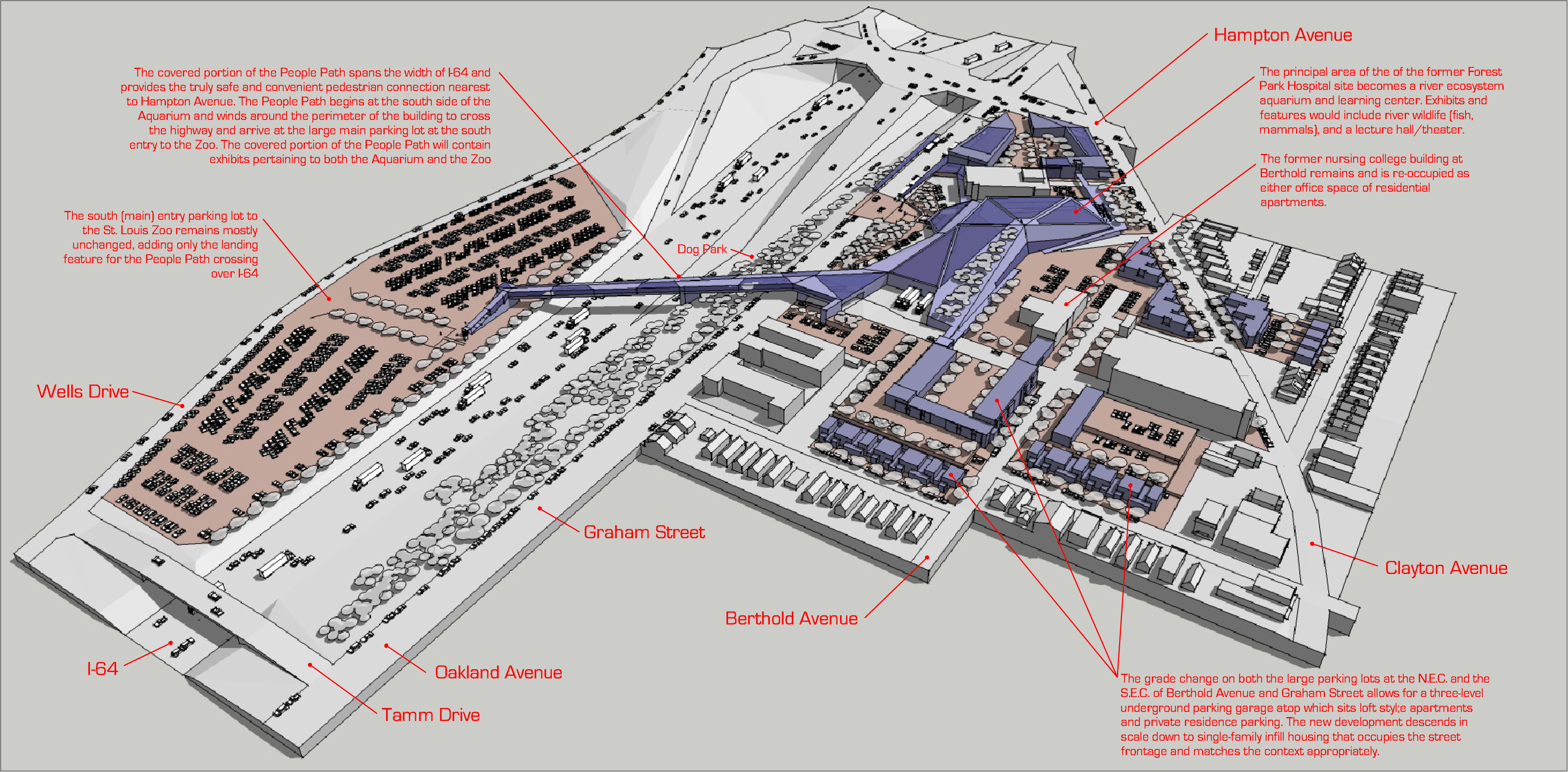In this directly overhead view, the scope of the proposed redevelopment area is clearest. The newly acquired land is fully built out to the street edges, providing visitors and residents with the most complete experience of urban neighborhood vitality that is possible. The People Path can be seen wrapping the exterior of the aquarium from the south all the way across the highway to the zoo’s main parking lot.[click to enlarge]. The commercial court can be seen thoroughly covering the northeast corner of the land, where a hulking and crumbling parking garage now stands. The aquarium will take advantage of the deep basements of the hospital buildings that now exist to create exhibit viewing from both beneath the river water and above. The mixed-use buildings along Clayton will strengthen pedestrian connection to the popular restaurants and bars of Clayton-Tamm, and encourage more commercial development between. The three two-level parking garages will amply supplement the existing five-level garage with additional parking, and the aquarium will offer the region a unique attraction that can prove to be a great addition to the zoo [click to enlarge].