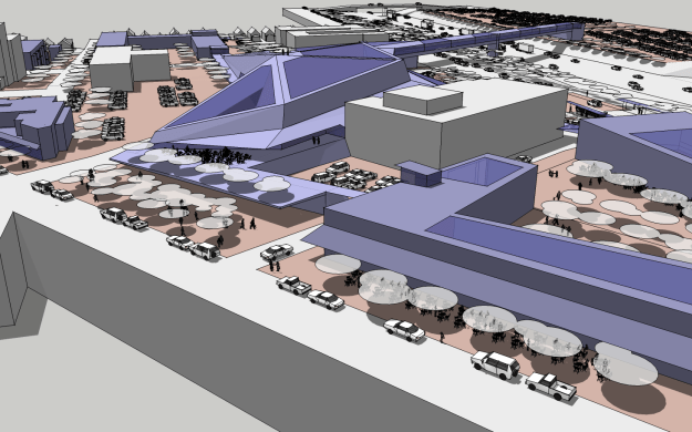 In this aerial view from the east, an arrangement of new commercial buildings will sit atop a two-level parking garage and offer mixed uses such as restaurants, retail and office spaces [click to enlarge].