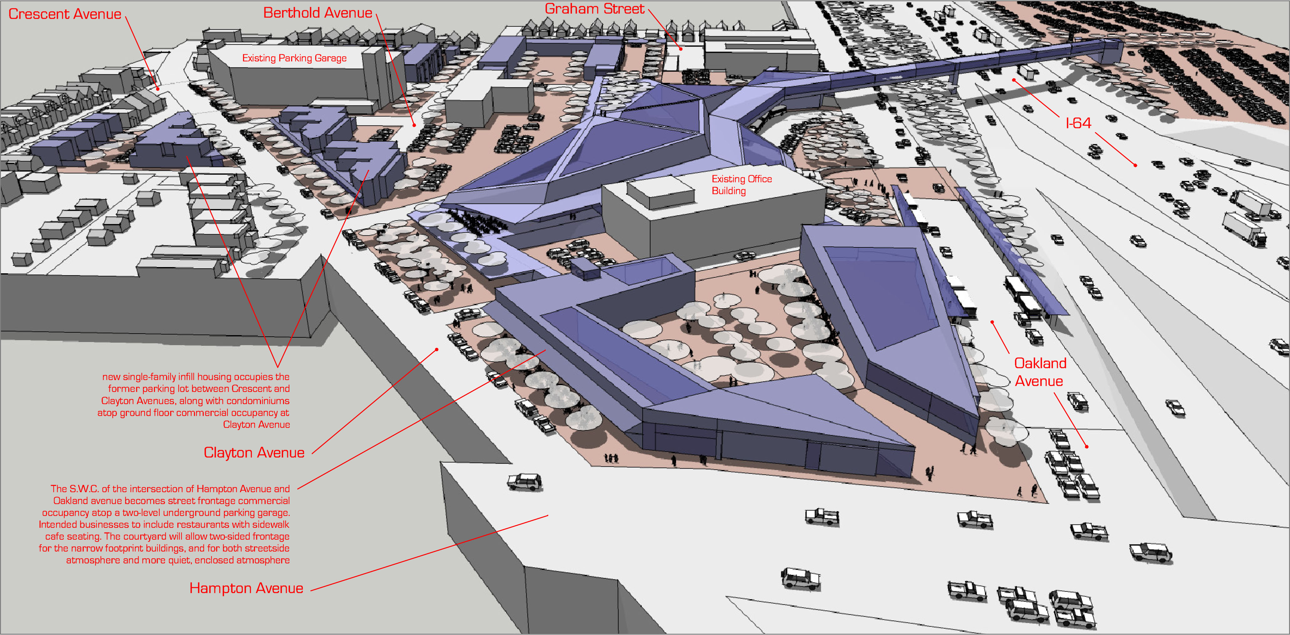 The proposal envisions the St. Louis Zoo parceling out portions of the newly acquired land to allow both private commercial and residential development to reestablish street edges and enliven the Clayton-Tamm neighborhood with new housing types and business activity. The large size of the acquisition should allow the Zoo to easily make use of what is needed to create a new attraction with ample parking capacity, and tuck itself neatly into an appropriately scaled urban environment that is both economically invigorating becoming of the scale of this neighborhood.